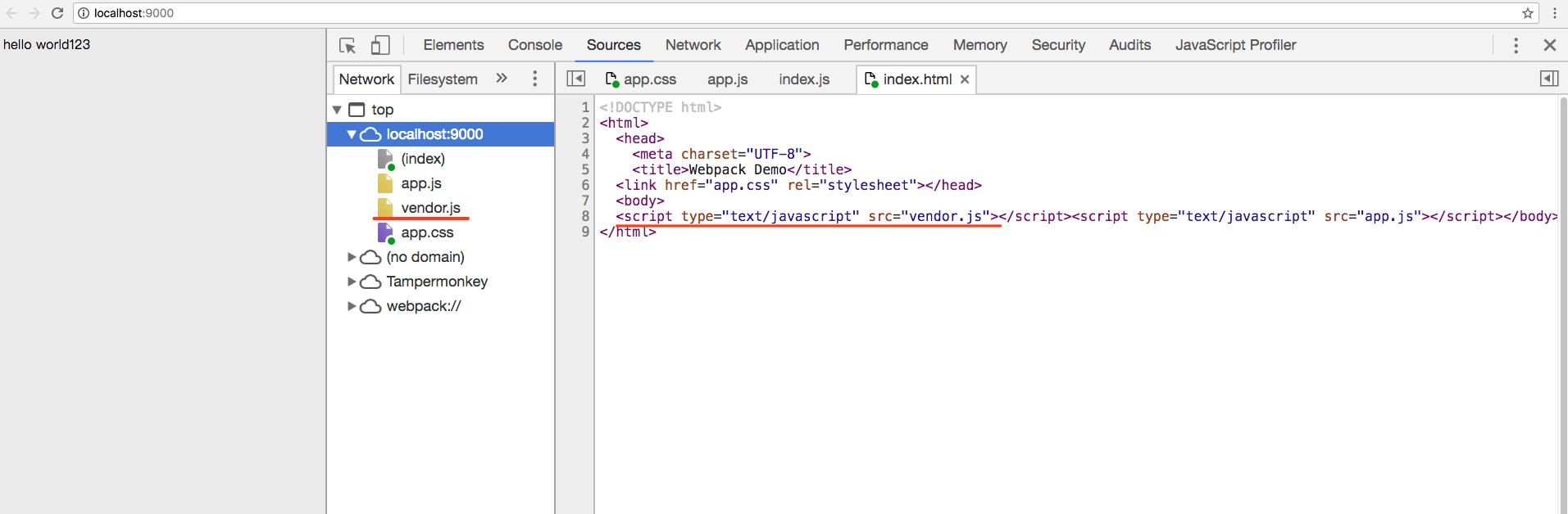 将第三方组件代码和本地编写的代码分离后可以看到新生成了一个vendor.js文件,如下:
