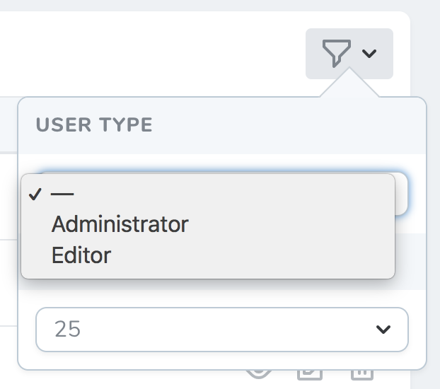 options 方法返回一个键值对数组,数组的键是展示给使用者选择的文本。数组的值则会在选择后作为 $value 参数传入 apply 方法。在示例中,过滤器定义了 2 个选项 : admin 和 editor。