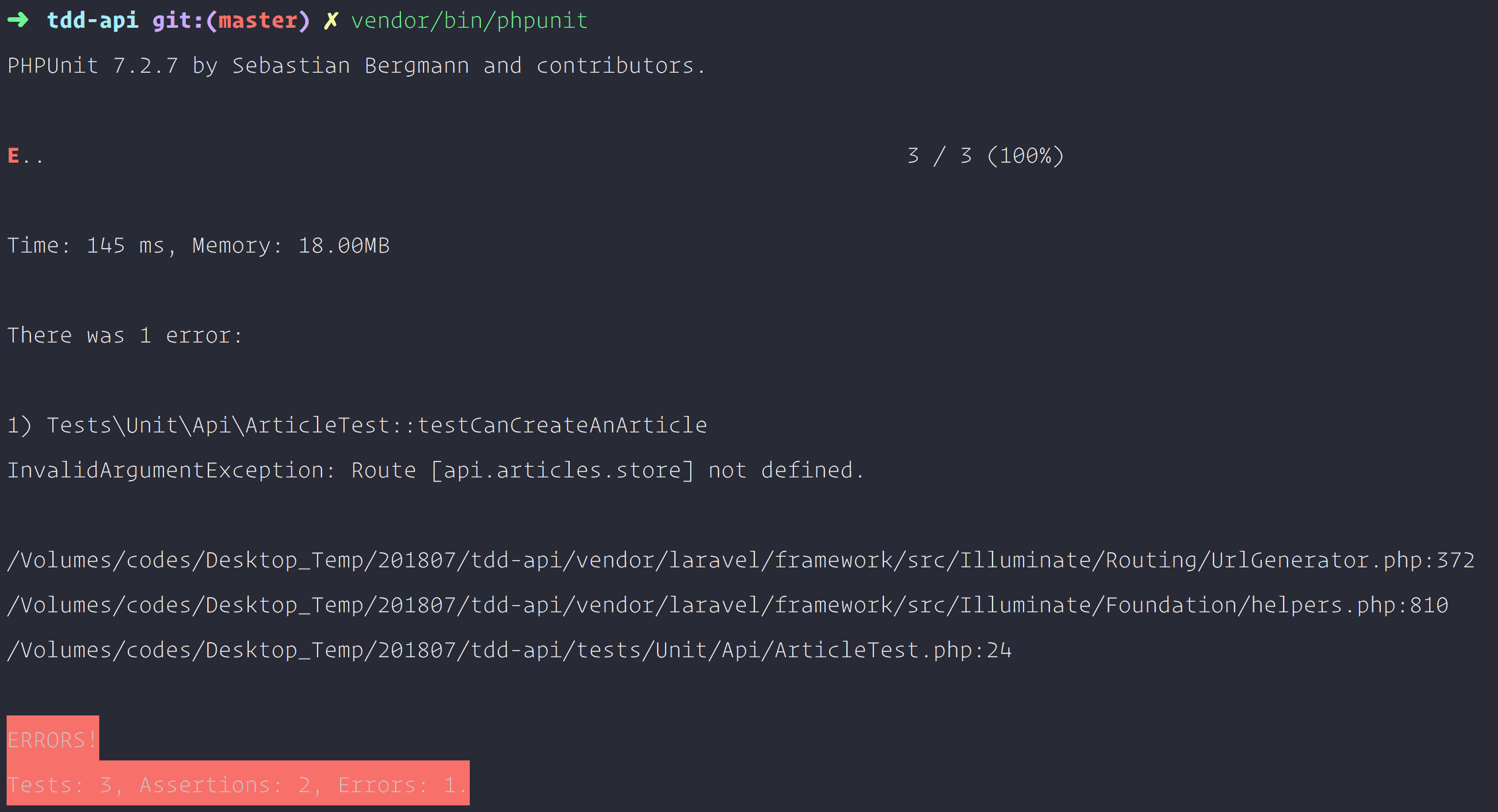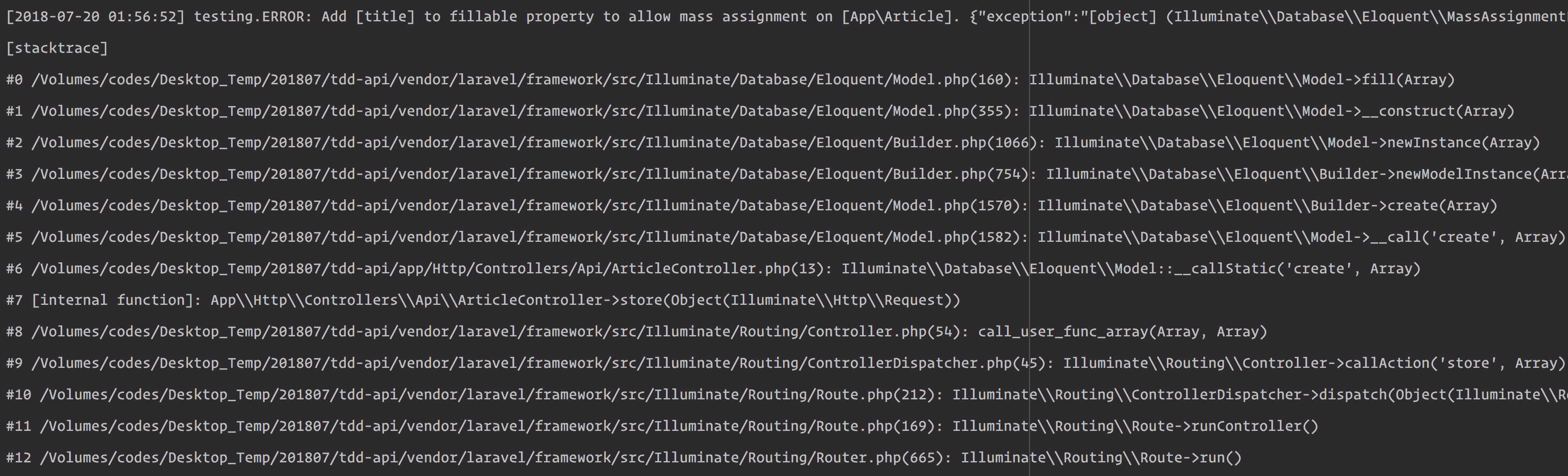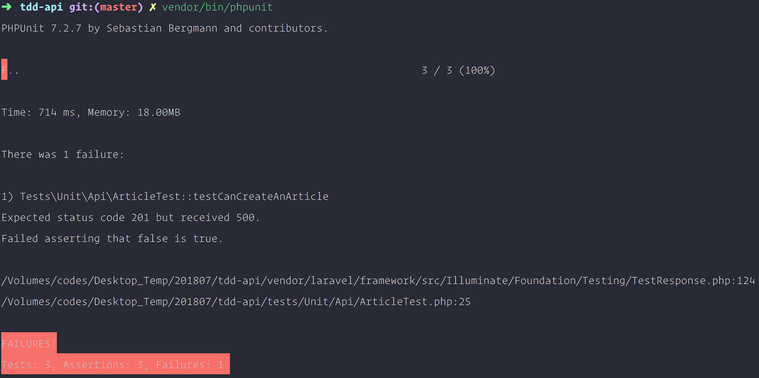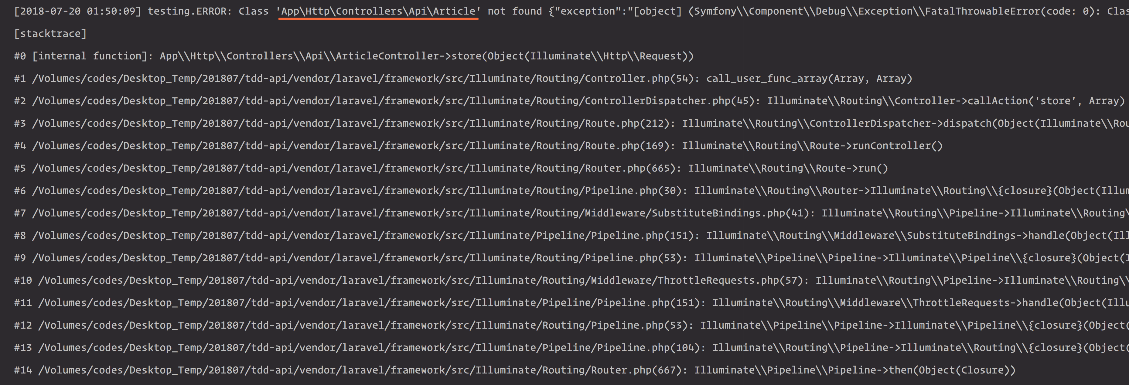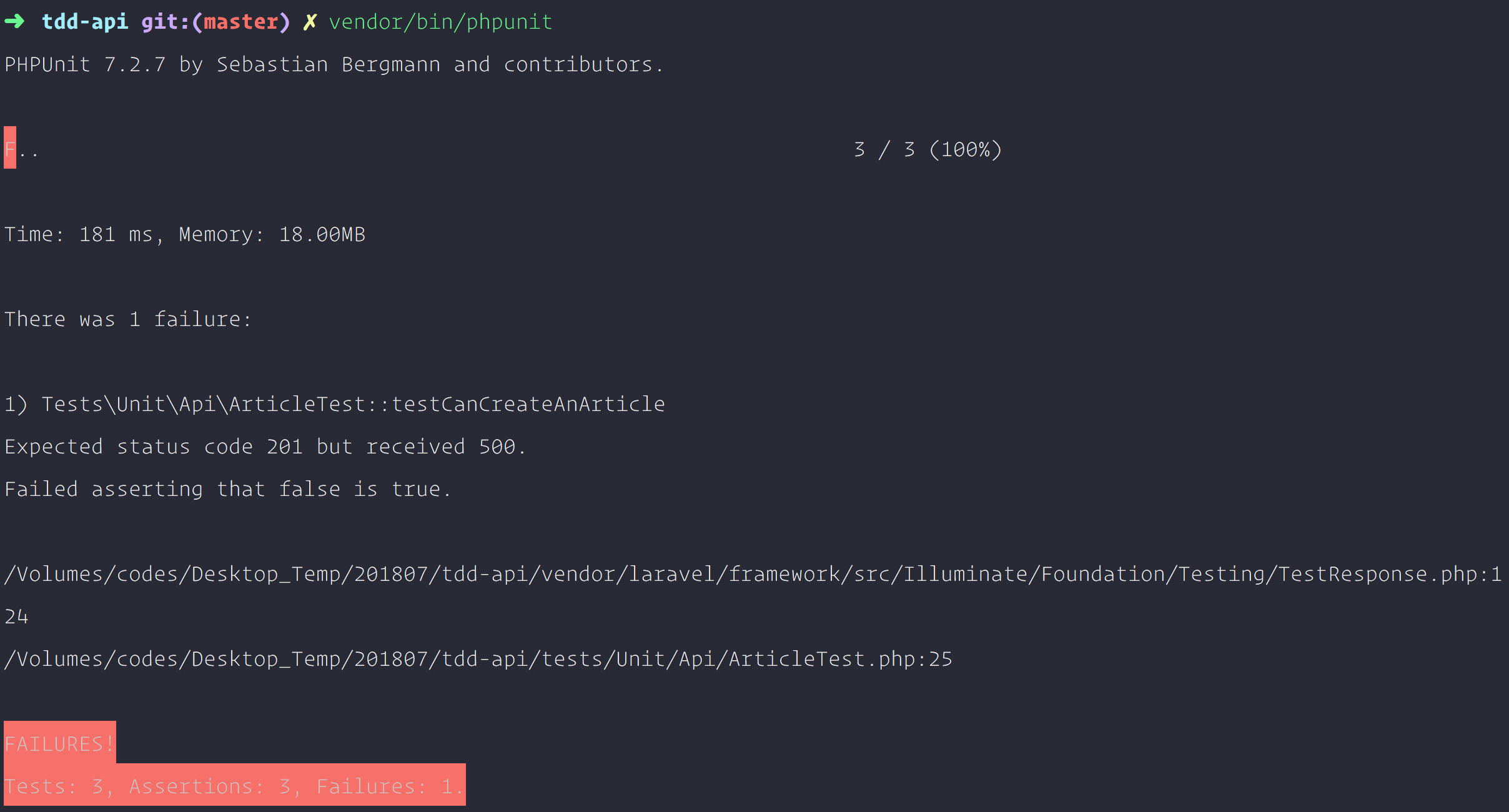 在测试中断言响应会返回201状态码但是却返回了500,是因为请求的路由指向的处理控制器文件不存在。这个api/v1/articles POST 路由在应用中并不存在所以针对这个请求应用抛出了500错误。