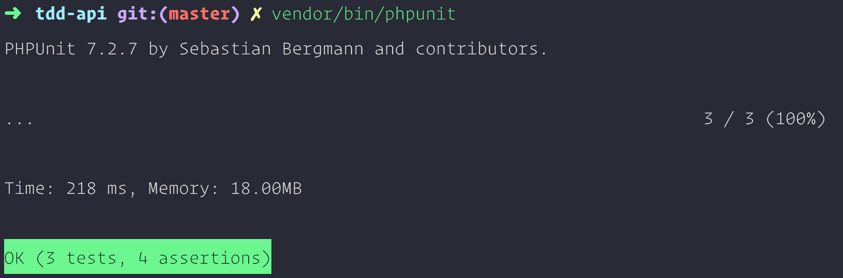 在创建好我们的第一个测试后,执行phpunit或者vendor/bin/phpunit