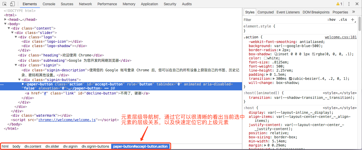 另外值得注意的是当我们选中某个元素,在底部会出现对应的层级关系树,方便我们定位它的上级元素。如下图: