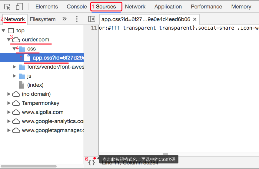 打开调试工具来到"Sources"->"Network"->选择具体的站点的CSS或者JS类型,如下: