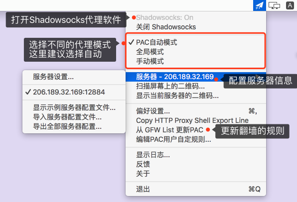 - 选择模式,这里推荐使用PAC配置,并且推荐使用之前记得点击"从GFW List更新PAC"拉取最新的规则。