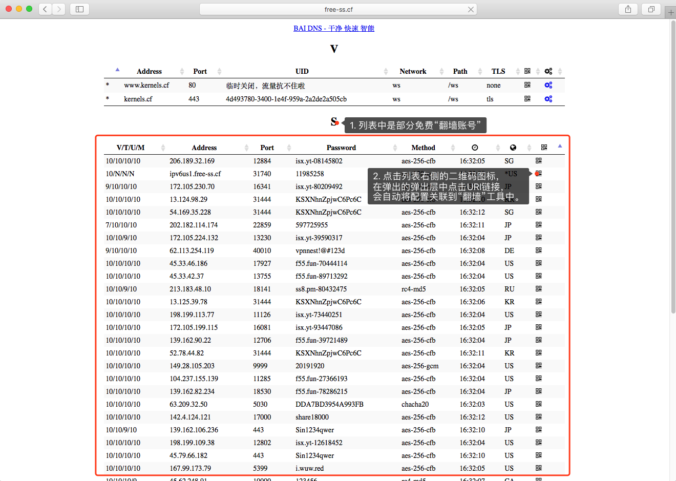 方法一: 在free-ss.cf站点上点击可用的服务器配置二维码小图标,扫描弹窗中的二维码信息,然后使用已有的Windows系统或者MacOSX系统服务器配置生成二维码供移动设备扫描。