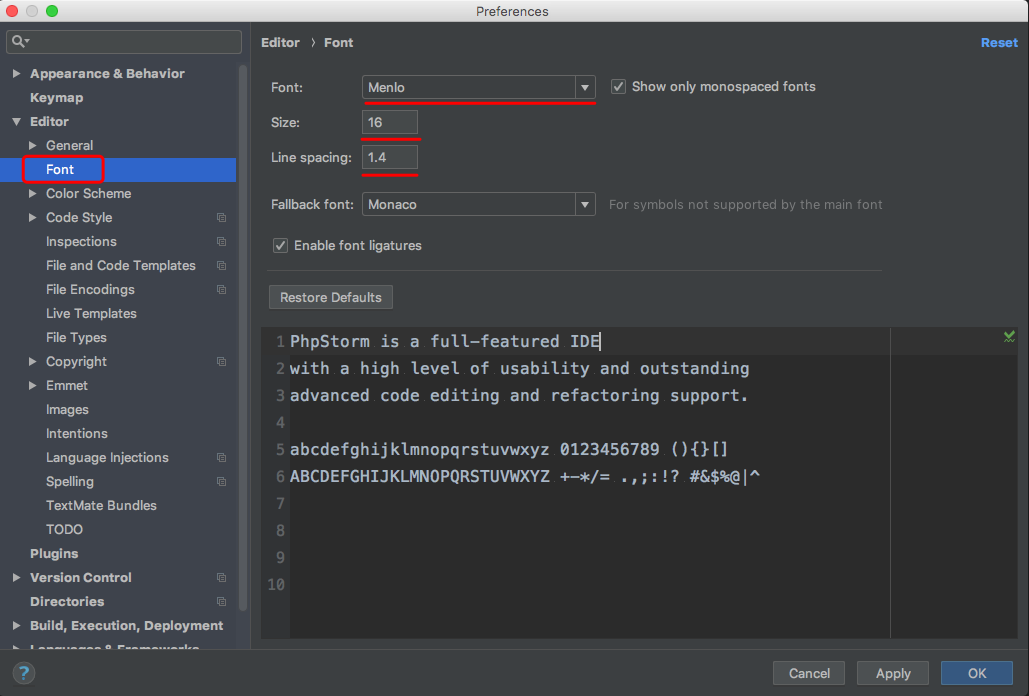 使用快捷键Command + ,进入配置中找到Editor->Font,修改右侧的Font、Size、Line Spacing,在配置的下方会有实时预览,可以参照预览自行配置适当的文字样式。