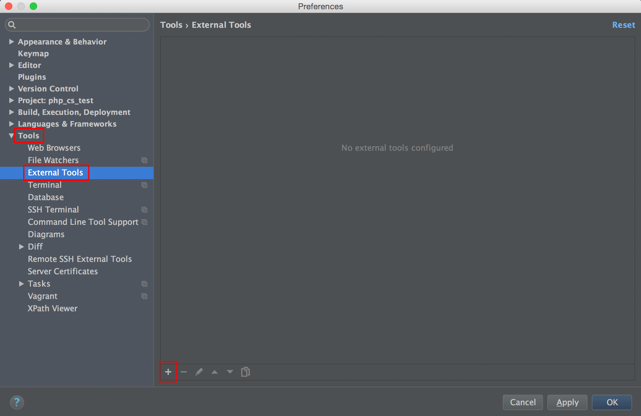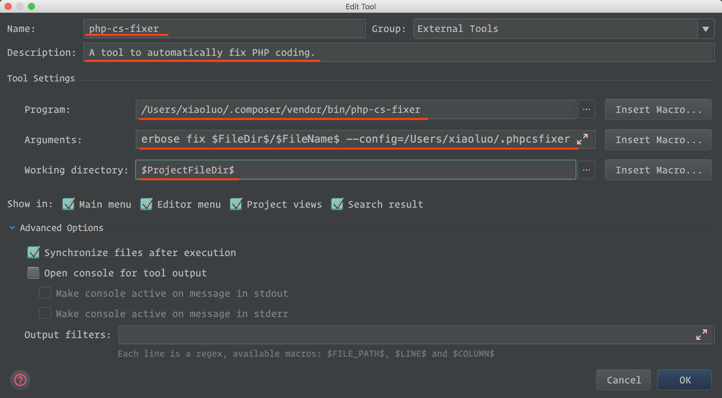 Name: php-cs-fixerDescription: A tool to automatically fix PHP coding.Program:/Users/xiaoluo/.composer/vendor/bin/php-cs-fixer,其中/Users/xiaoluo/为当前用户的家目录。Parameters:--verbose fix $FileDir$/$FileName$ --config=/Users/xiaoluo/.phpcsfixer,其中/Users/xiaoluo/为当前用户的家目录。Working Directory: $ProjectFileDir$