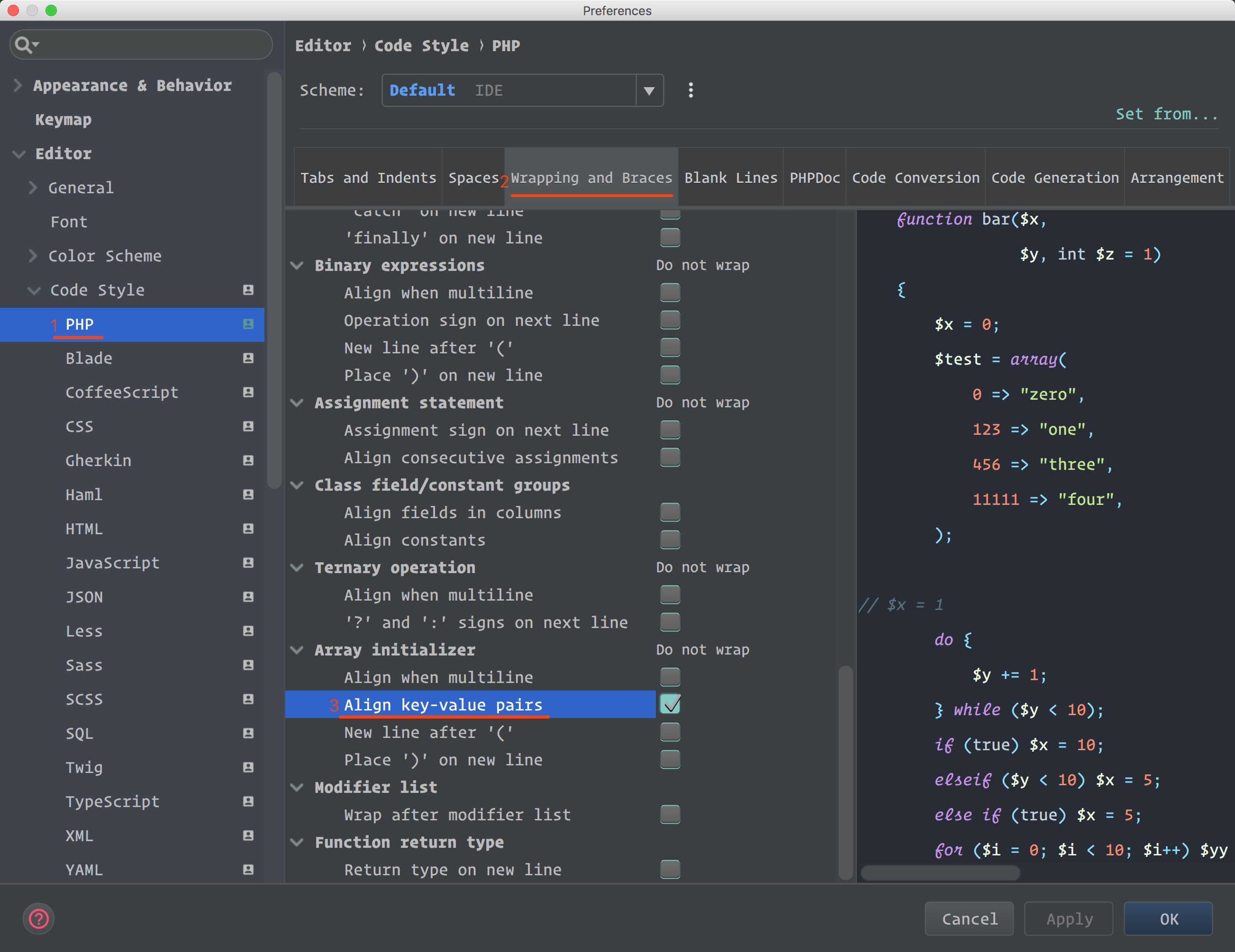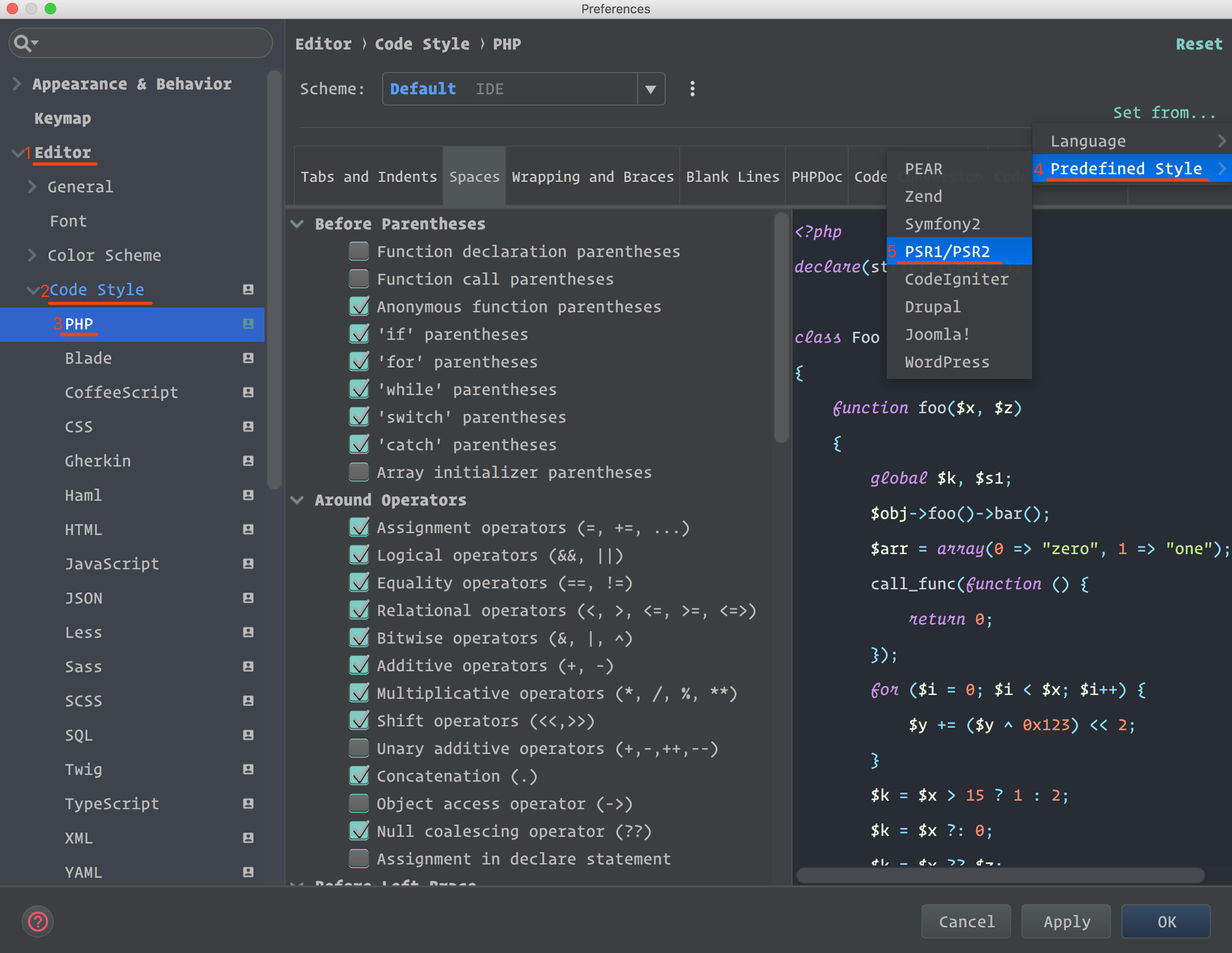 Preferences -> Editor -> Code Style -> PHP : Set from… -> Predefined Style -> PSR1/PSR2
