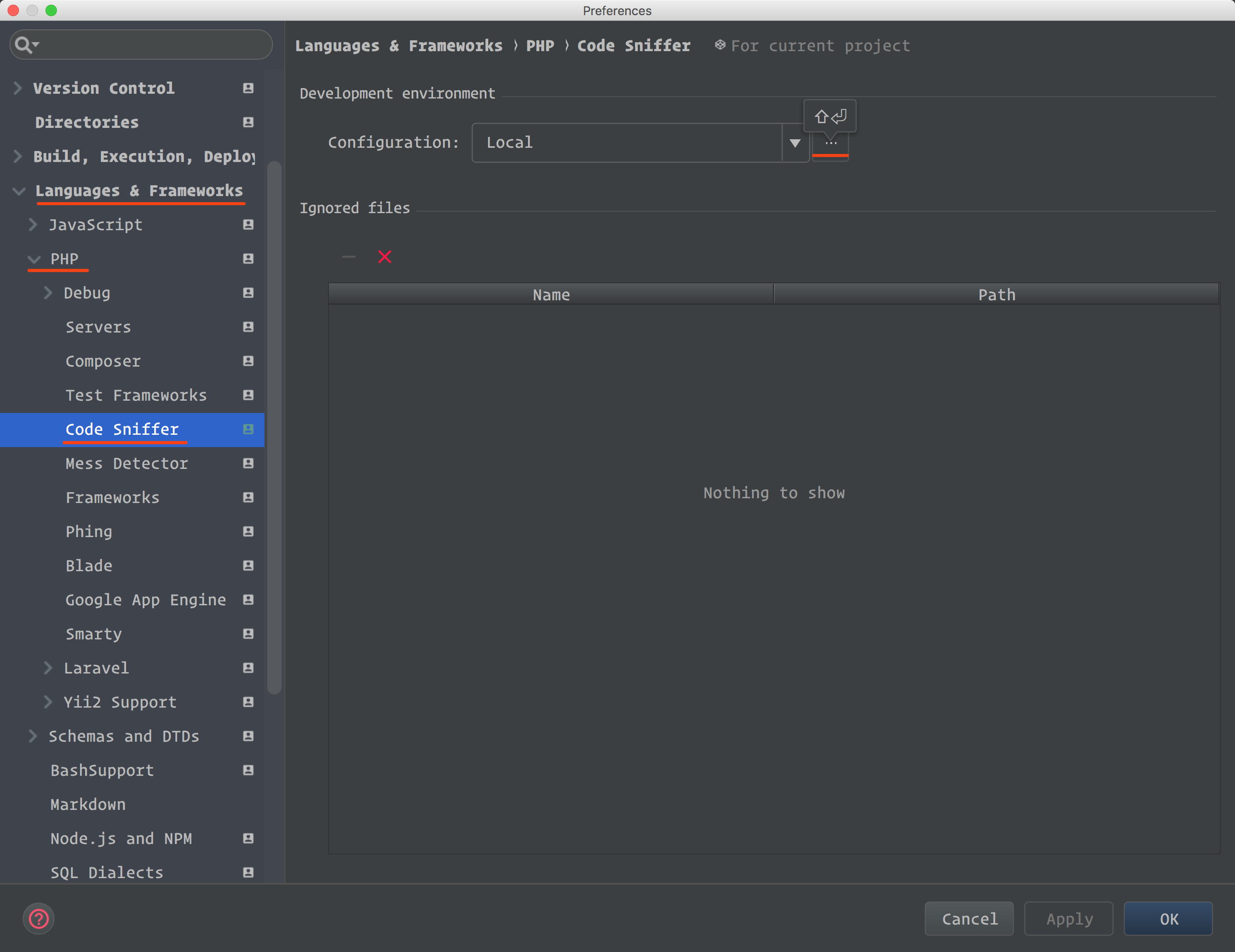 Preferences -> Languages & Frameworks -> PHP -> Code Sniffer