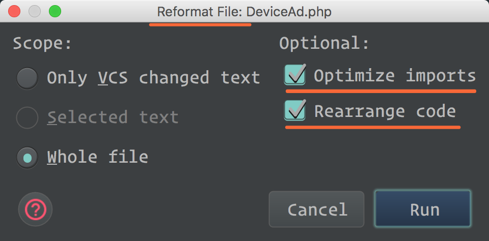Optimize imports: 没用到的namespace,use会自动移除。Rearrange code: 会自动依据Code Style的Arrangement规格将代码重新排序。