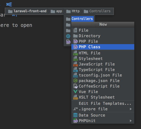 Command + ↑快捷键呼出文件路径导航,并选择controllers目录,如下操作界面: